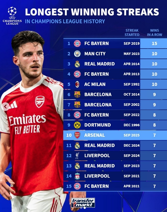 1月21日讯 阿森纳本赛季在欧冠豪取7连胜,德转也盘点了欧冠历史连胜纪录榜,具体如下(日期为连胜开始时间):